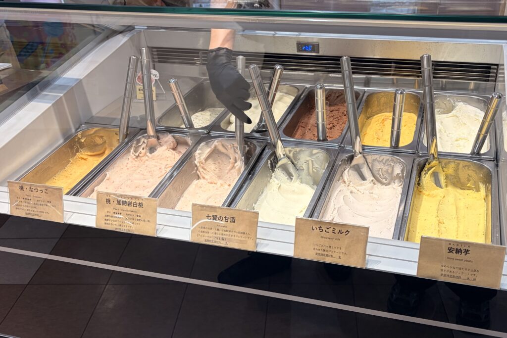 この日は、全部で12種類のジェラートが並んでいました。桃やぶどうなど、山梨ならではのフルーツを使ったものが多く、どれもとても魅力的でした。迷う時間もとっても楽しい!